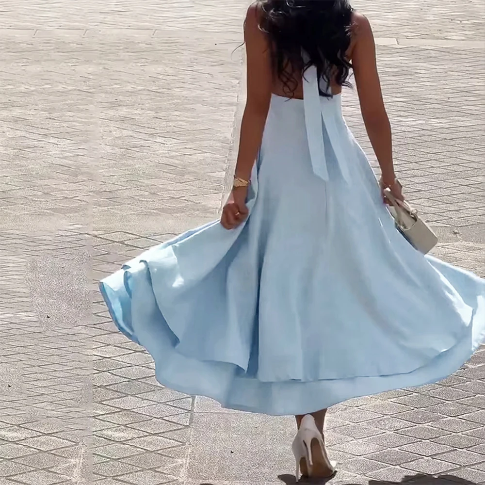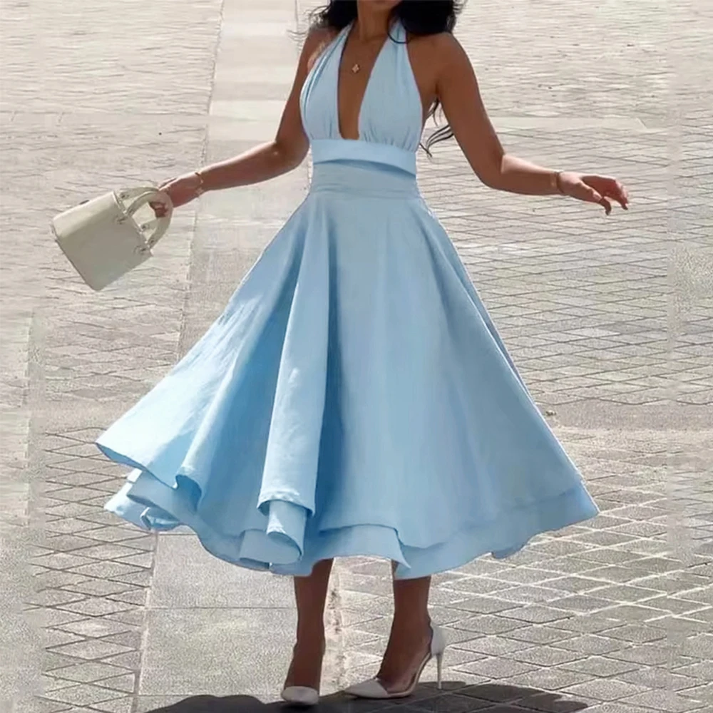 Summer Dresses Sexy Plain Sleeveless Halter Neck Nipped Waists Layered Draped Midi Evening Dresses for Women